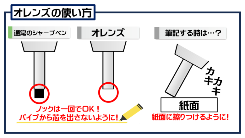 芯全体をガイドパイプで保護しつつ紙面にペン先を擦りつけるようにして筆記する必要があります。